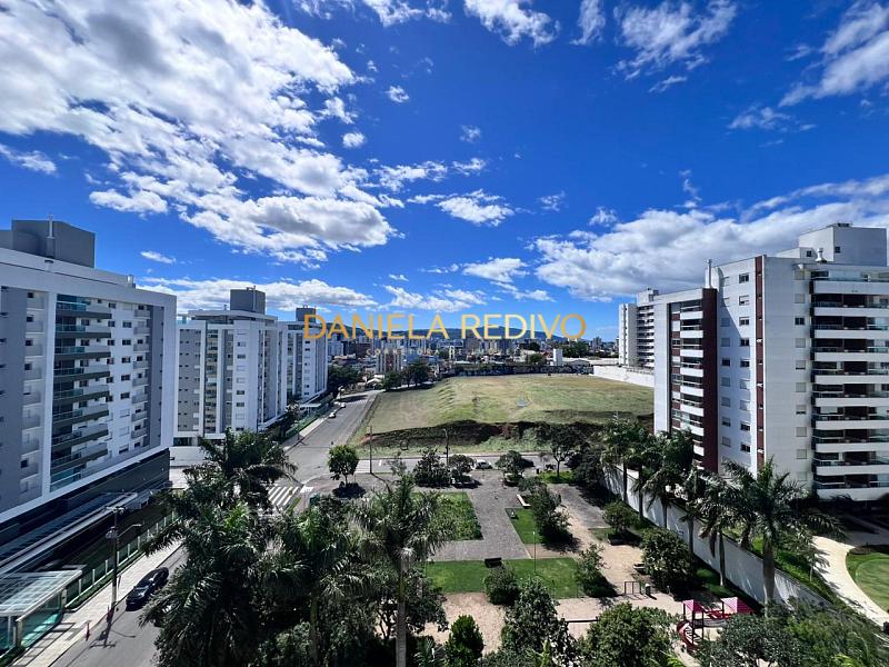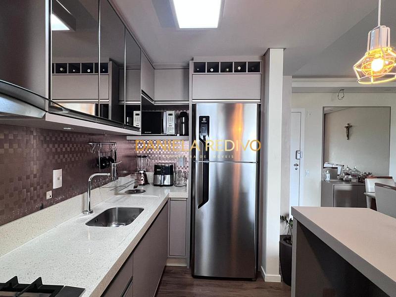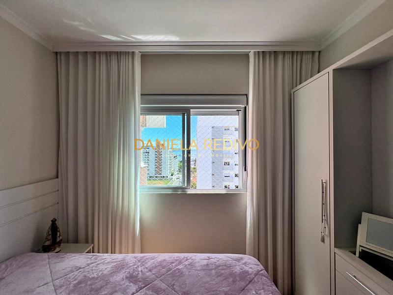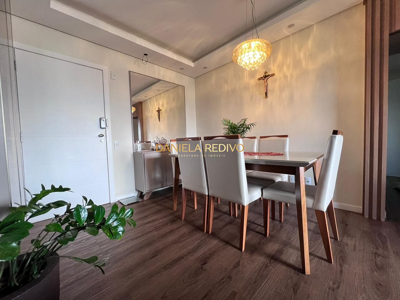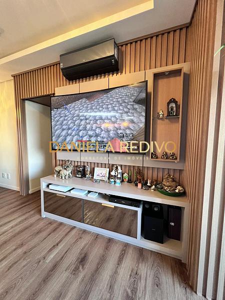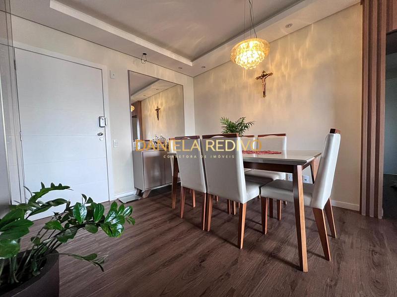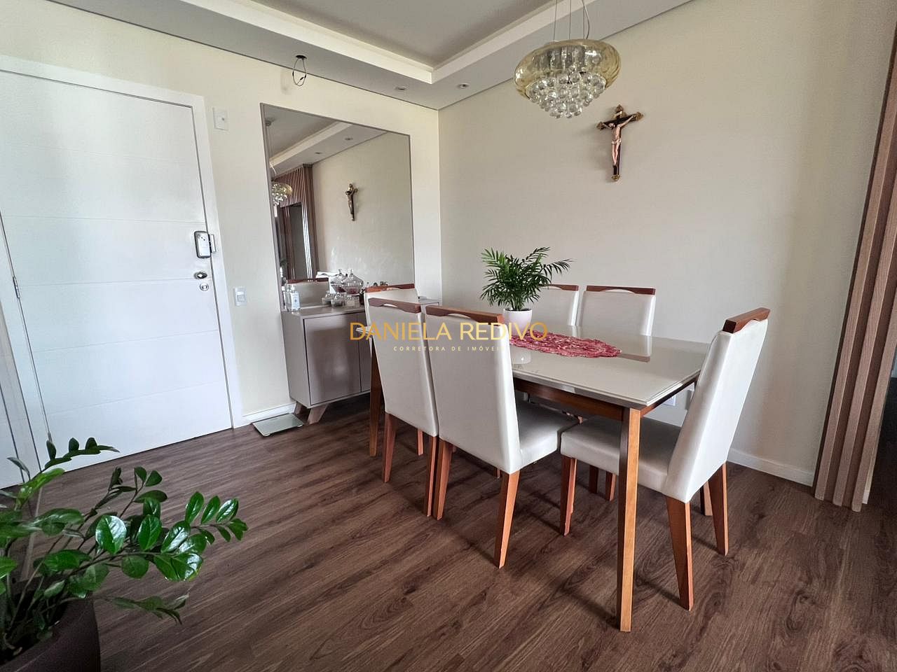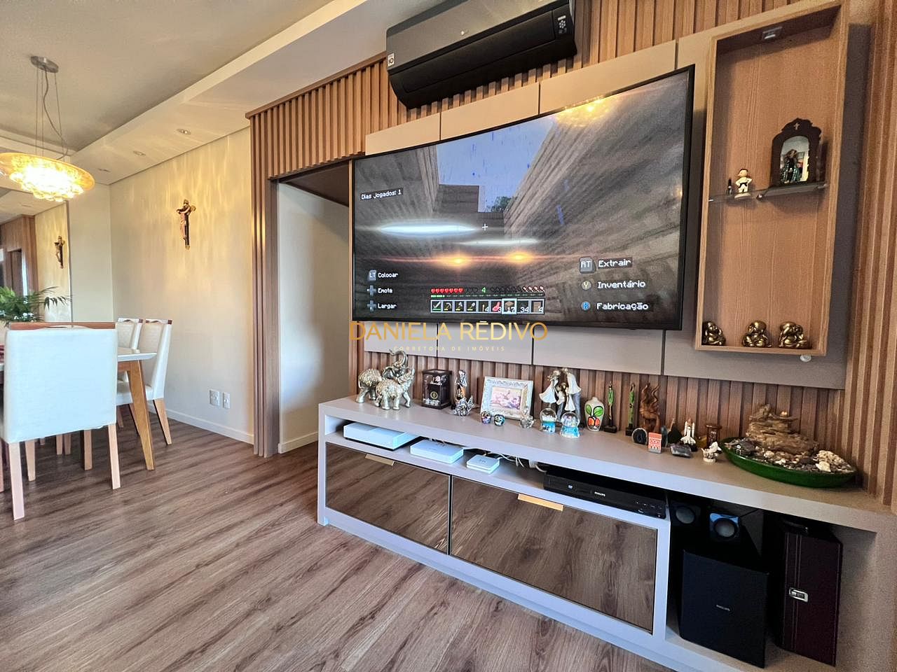 Apartamento de 84 m² privativos, localizado no 7º andar, com 3 dormitórios (sendo 1 suíte e 2 demi-suítes), 2 vagas de garagem e um living espaçoso integrado à sala de jantar e sala de TV.